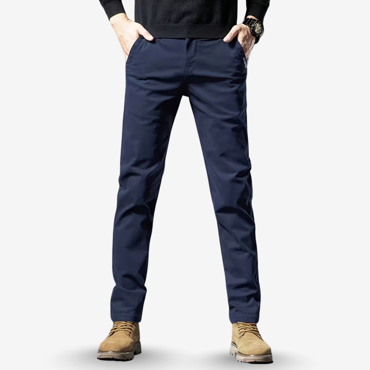 - Straight-leg silhouette with a refined, tailored profile