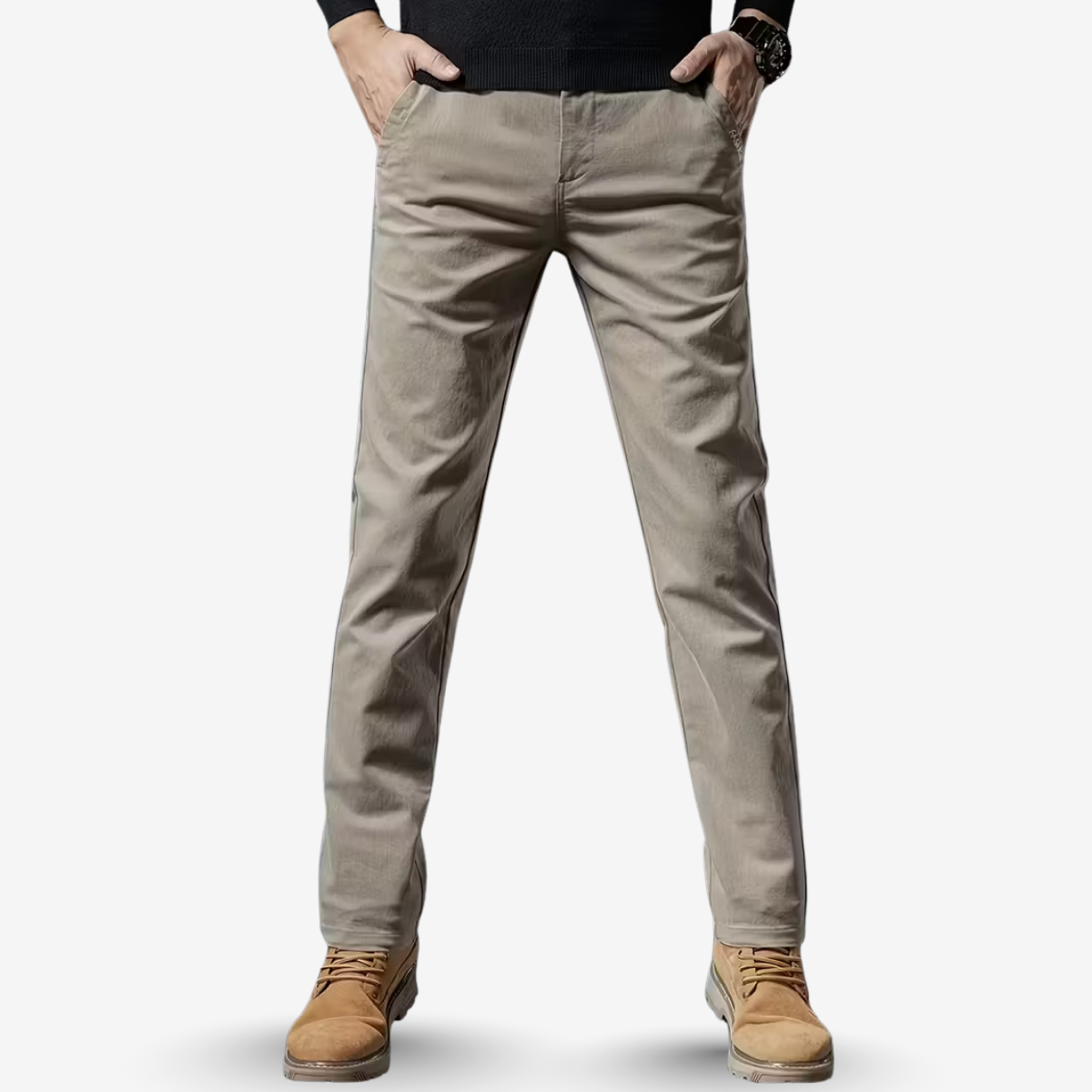 Made from high-cotton woven fabric with slight stretch, these trousers maintain a smooth, structured appearance while offering comfortable mobility. The mid-waist fit, straight-leg cut, and button-fly closure provide a balanced and modern profile suited to office settings, commutes, or daily routines.