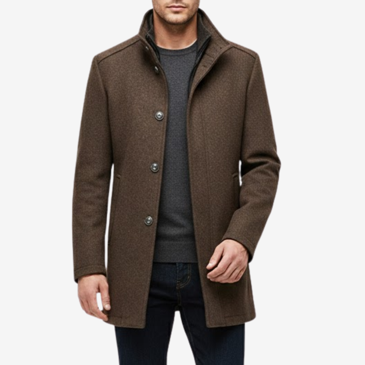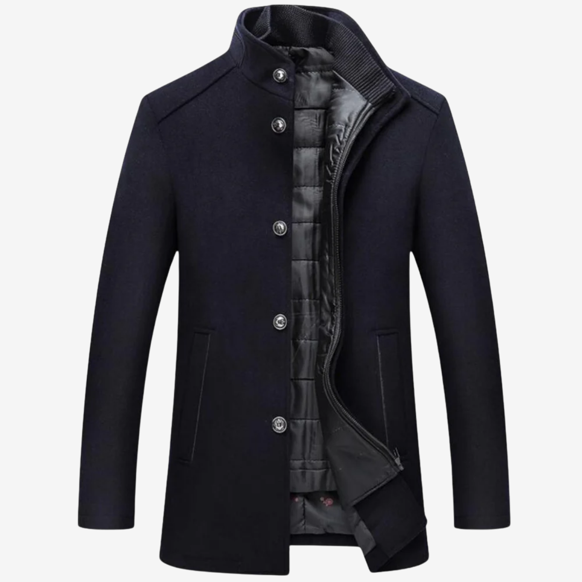 Made from a substantial wool-blend outer, this overcoat offers a smooth, weighty drape that maintains shape while remaining comfortable to layer. The built-in vest panel beneath the stand collar adds a refined touch, enhancing structure and giving your outfit a composed finish with minimal effort.